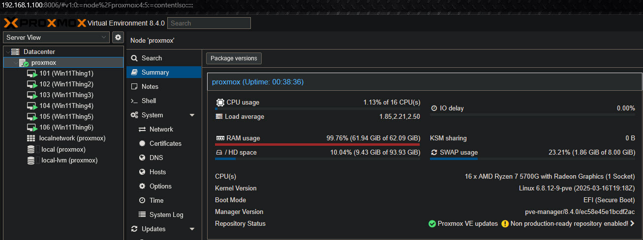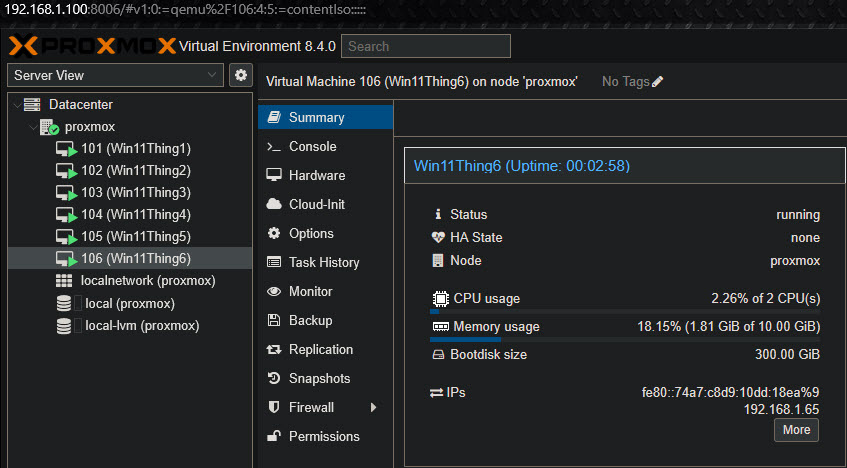 In the above photos you can see that the 6 Win11 VMs are using 10 GB RAM each. 60 GB RAM combined. There's 64 GB RAM total installed on the system. 10 GB RAM is not really enough to run Win11 on efficiently. So, if you're going to run this many VMs I recommend installing 128 GB RAM total on the computer. I recommend assigning 20 GB RAM to each Win11 VM. This will give you a pretty healthy amount of RAM. Then remember to leave some RAM unassigned to give Proxmox some RAM to work with as well. 2 GB RAM minimum for Proxmox OS & VE services. Plus designated memory for guests. For Ceph or ZFS additional memory is required, approximately 1 GB memory for every TB used storage.